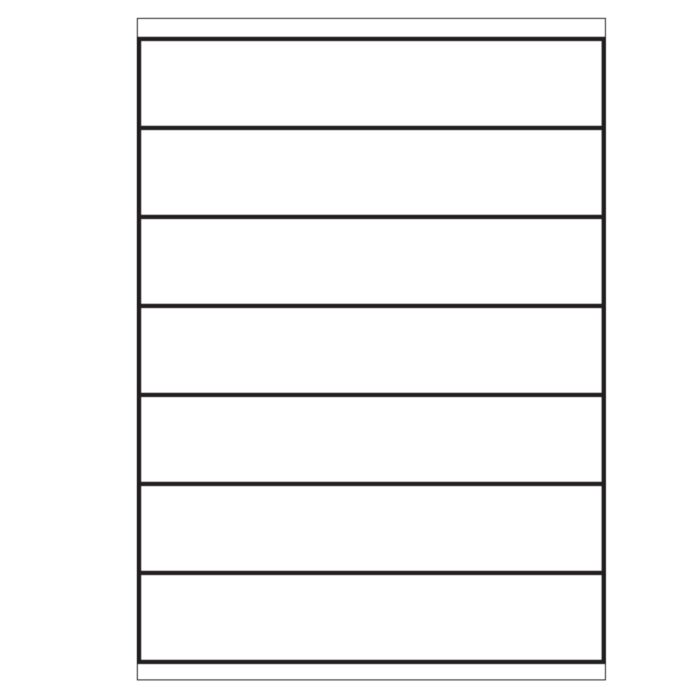 Zelfklevende, mat witte etiketten op A4 vellen. Afmetingen: 210 x 40 mm. 7 Etiketten per vel. Verpakt per 100 vel (700 etiketten). Het papiergewicht van de etiketten is 68 g/m² en van het achtervel 55 g/m².